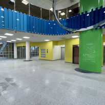 Hydrogen, usually invisible, becomes a friendly and visible presence. The H₂ symbol is reimagined as a smiling character, guiding visitors with playfulness and warmth. Graphic lines ripple across floors and walls, echoing the movement of molecules. A palette of sky blue, soft green, and lemon yellow energizes the architecture without overwhelming the senses. This identity system, from mascot to signage, weaves together clarity, curiosity, and coherence, making science feel human and accessible.